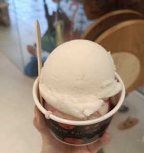 Snow Factory sells yogurt-based ice cream, and other yogurt related products, such as yogurt drinks and yogurt with jam on the side. The texture of Snow Factory yogurt ice cream is light and airy, despite using the same method as Italian ice cream because no egg yolks are added. The result is that it is healthy and natural without a strong chemical taste, and lower in calories. They also have a variety of flavours and unlimited free samples, so you can try all the flavours until you find one you like.